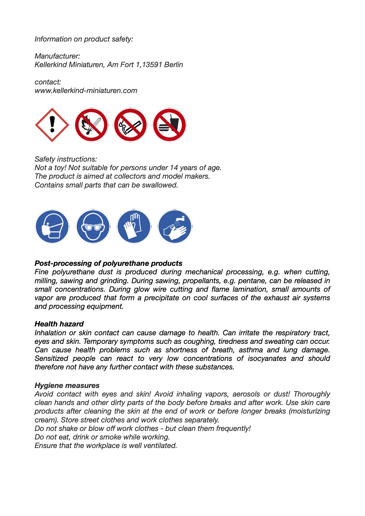 Before assembly, check for accuracy and remove release agent with isopropyl alcohol, degreaser, or acetone. Cut off sprues with a saw/cutter. Wear a dust mask or respirator during mechanical processing to avoid inhaling dust particles.